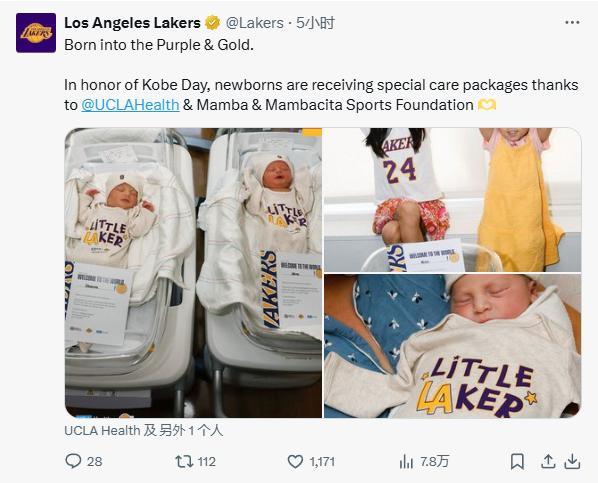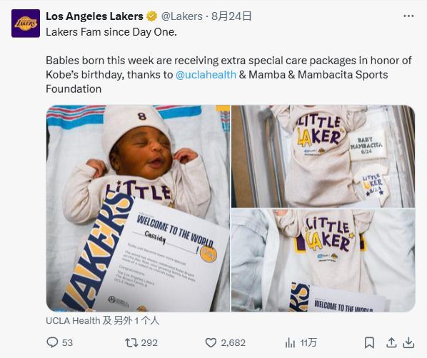 5、湖人官方:“从第一天起就是湖人大家庭的成员。感谢 Mamba & Mambacita 体育基金会,本周出生的婴儿将收到额外的特殊护理包,以庆祝科比的生日。”